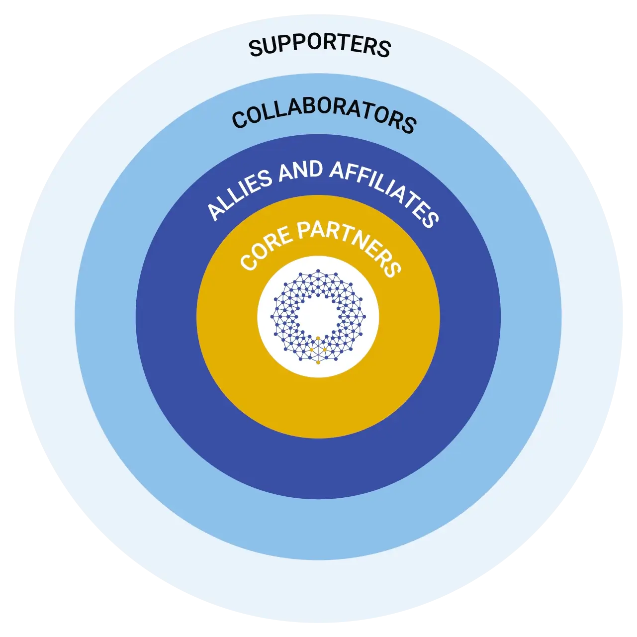 Concentric diagram illustrating the four levels of engagement in the JustRE Alliance. The innermost circle represents Core Partners (deepest strategic collaboration), followed by Allies and Affiliates (formal project participation), Collaborators (active working group participation), and the outermost circle, Supporters (basic informational involvement).